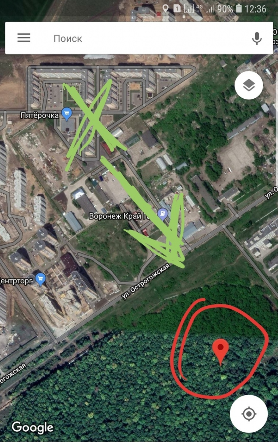 На опубликованном снимке со спутника зеленым цветом отмечено место пропажи и предполагаемое направление. Их удалось установить при помощи камер системы "Безопасный город". Красным кругом выделено место обнаружения тела.