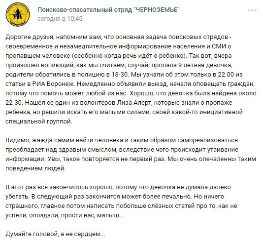 Причиной для написания обширного поста стал поиск 9-летней девочки, которая не вернулась вечером домой 4 мая. По мнению «Черноземья», волонтеры из «Лиза Алерт Воронеж» утаивали информацию о пропаже ребенка, чтобы взять себе все лавры.