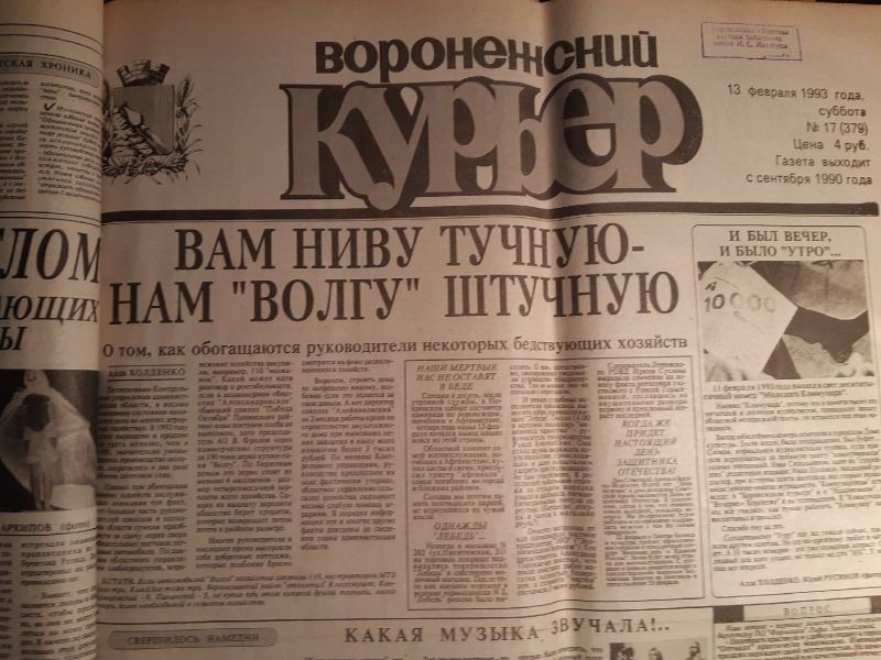 - Какой может идти разговор о рентабельности в акционерном обществе «Александровское» (бывший совхоз «Победа Октября» Панинского района) план поставок хлеба не выполнен, зато председатель АО В. Фролов через коммерческие структуры за 190 тонн зерна купил-таки «Волгу». По биржевым ценам это зерно стоит не меньше 4 миллионов – размер четырехмесячной зарплаты всего хозяйства. Однако на выплату зарплаты общество берет кредиты, которые возвращают потом в двойном размере, - писала в 1993 году в газете «Воронежский курьер» журналистка Алла Холденко.