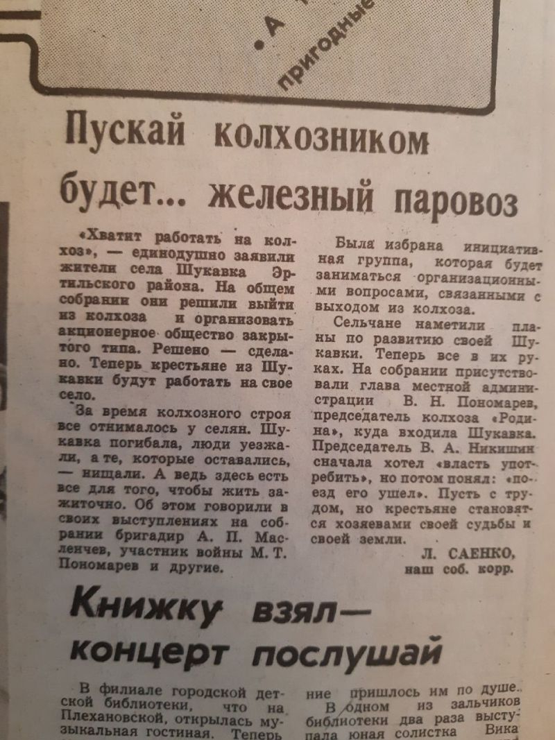 Да и простые местные жители в начале 90-х годов отказывались быть колхозниками. В 1992 году воронежская газета «Утро» сообщала новость из села Шукавки Эртильского района. Местные жители решили реорганизовать свой колхоз «Родина». Вместо коллективного хозяйствования из предприятия постановили сделать акционерное общество закрытого типа. Причиной этому было то, что в советские годы у жителей Шукавки колхоз якобы отнимал всю продукцию – мясо, овощи, фрукты. Сельчане массово уезжали со своих насиженных мест. Те же, кто оставался, стремительно нищали.