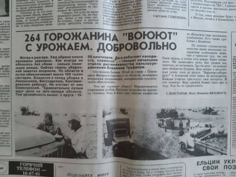 Так, в 1992 году урожай зерновых в Воронежской области оказался ниже, чем был в 1991 году. Причиной стало неравномерное созревание культур, а также большая нагрузка на единицу техники. В то время многие хозяйства не смогли обновить свои парки машинами. Также отмечались проблемы с бензином.