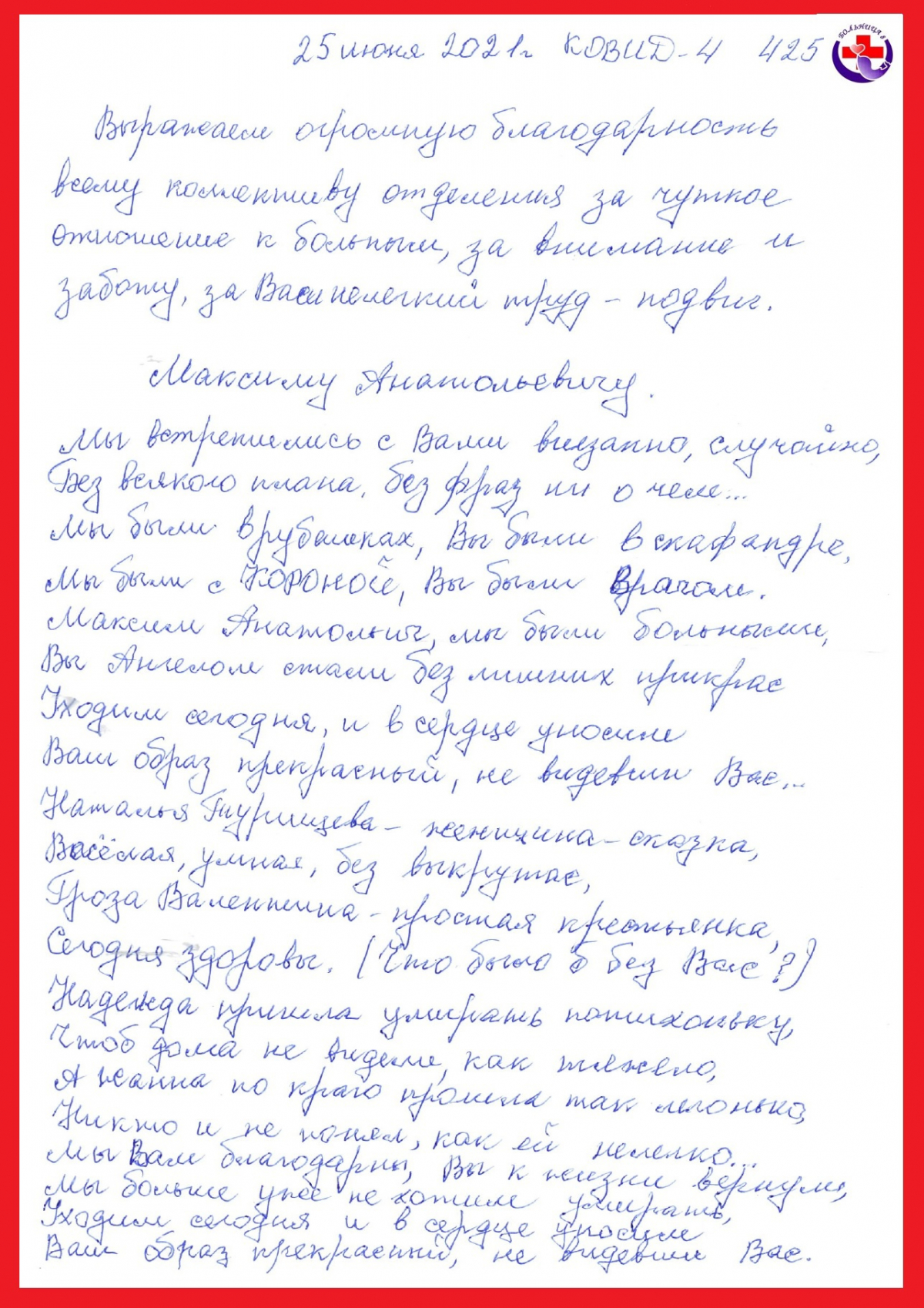 Стихотворение, опубликованное «ВКонтакте», было посвящено Максиму Смирнову, который до пандемии работал хирургом, но с появлением COVID-19 стал помогать пациентам бороться с опасным вирусом. Также в обращении к доктору упоминались имена других сотрудников больницы, которые тоже заслужили «Спасибо».