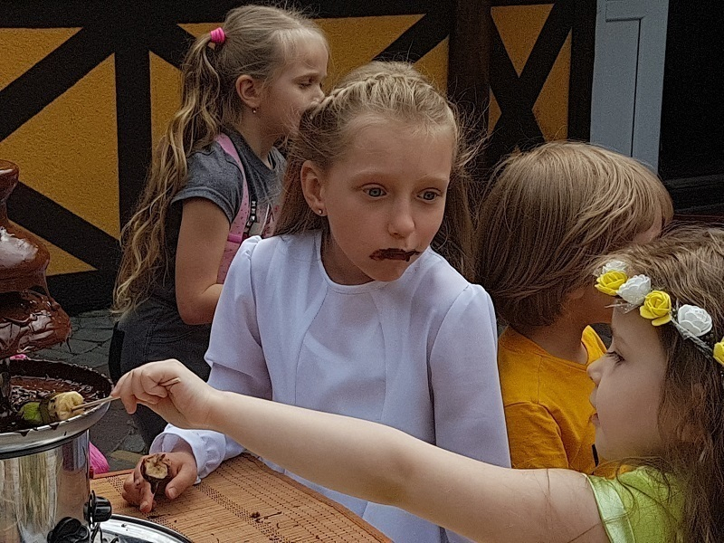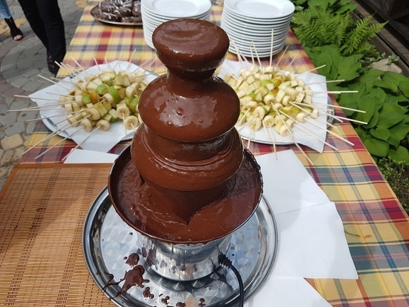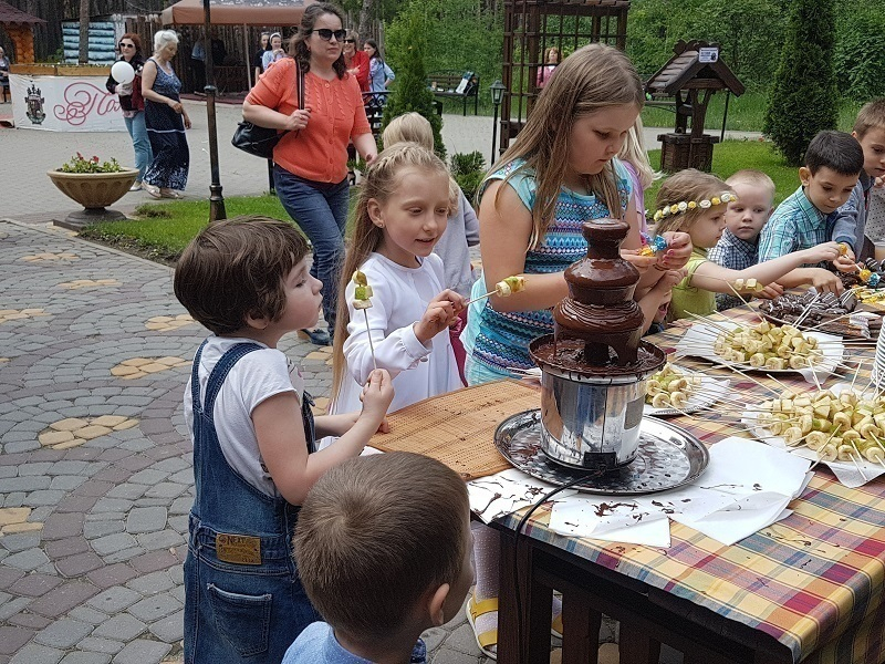 Когда главных гостей праздника позвали к столу, накрытом специально для них, маленькие сладкоежки просто ринулись к угощениям. Особой популярностью у малышей пользовался шоколадный фонтан.