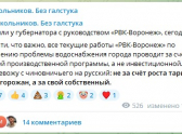 «Кстати, что важно, все текущие работы «РВК-Воронеж» по решению проблемы водоснабжения города проводит за счёт своей производственной программы, а не инвестиционной. Перевожу с чиновничьего на русский: не за счёт роста тарифа для горожан, а за свой собственный».