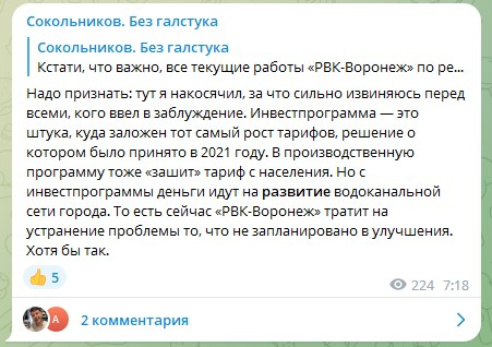 «Надо признать: тут я накосячил, за что сильно извиняюсь перед всеми, кого ввел в заблуждение. Инвестпрограмма — это штука, куда заложен тот самый рост тарифов, решение о котором было принято в 2021 году. В производственную программу тоже «зашит» тариф с населения. Но с инвестпрограммы деньги идут на развитие водоканальной сети города. То есть сейчас «РВК-Воронеж» тратит на устранение проблемы то, что не запланировано в улучшения. Хотя бы так».