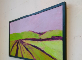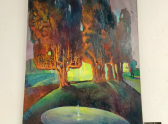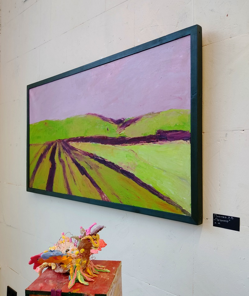Рядом работа Анастасии Плотко «Петрикор» (холст, масло) завораживает своей почти скульптурной материальностью. Художница исследует запах земли после дождя, переводя мимолетное ощущение в плотную, осязаемую визуальную форму.