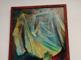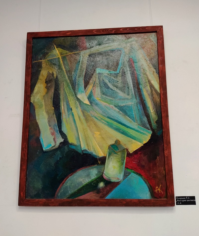 Картина Анны Кокориной «Аллегория христианства» (холст, масло). Сложная, многослойная работа в сдержанной палитре предлагает глубокое символическое высказывание, перекликающееся с наивной мощью детских работ и создающее смысловую глубину всей экспозиции.