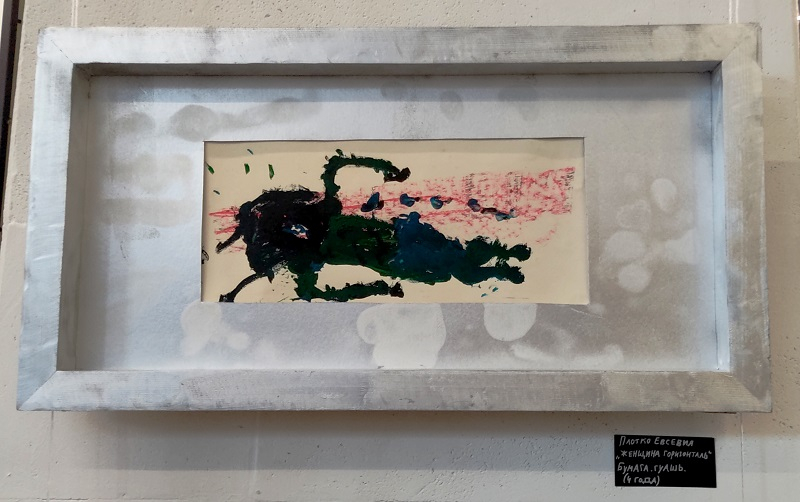 Другая её работа, «Женщина-горизонталь» (бумага, гуашь), созданная в четыре года, поражает своим лаконичным и мощным образом. Уверенная линия и смелое цветовое пятно складываются в монументальный и в то же время очень нежный образ.