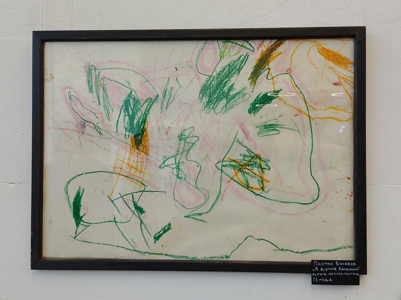 Картина юной Евсевии Плотко «В душе Кандинский» (бумага, масляная пастель), созданная в три года, — это взрыв чистой энергии цвета и формы. Яркие, динамичные мазки свидетельствуют о смелом эксперименте и интуитивном чувстве композиции.