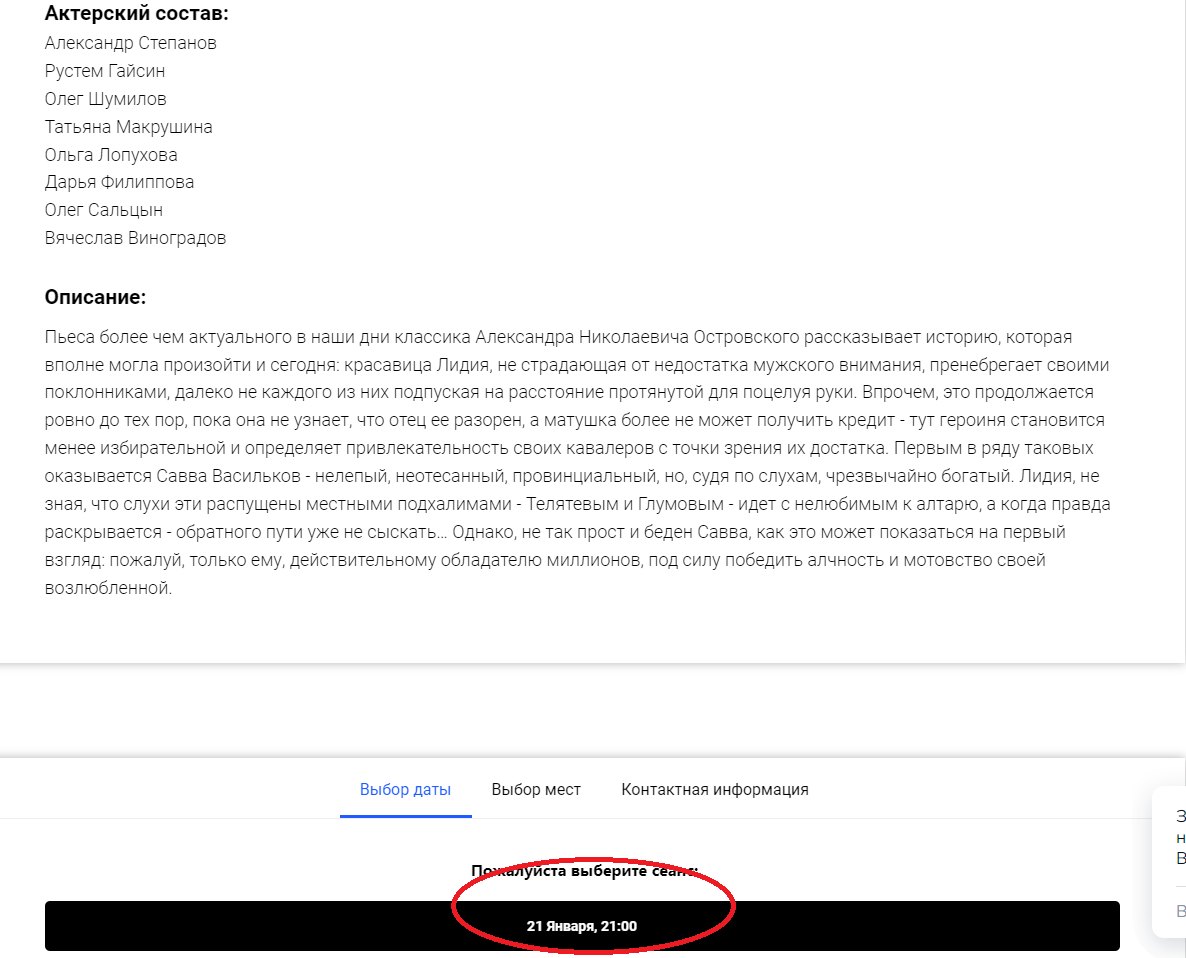 Тут только наш Евгений решил сам зайти на сайт Зимнего театра драмы и обнаружил, что ни «Бешеных денег», ни спектакля в 21 час в афише не существует. И реальные билеты на спектакль 21 января, только на 18.00 подешевле будут.