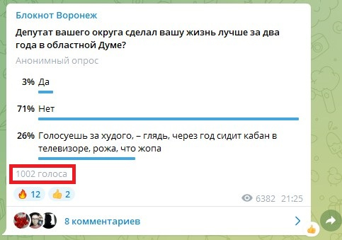 Телеграм-канал «Блокнот Воронеж» провёл опрос среди подписчиков. Сам вопрос звучал так: «Депутат вашего округа сделал вашу жизнь лучше за два года в областной Думе?».