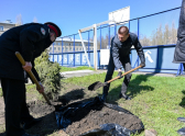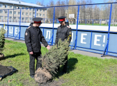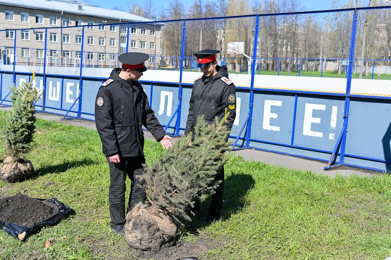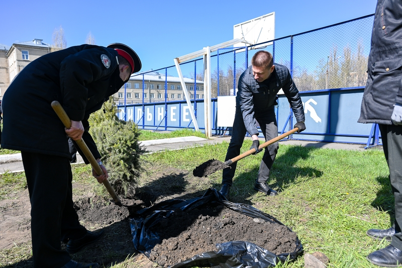 Участники акции высадили возле здания Михайловского кадетского корпуса 20 саженцев: 4 ели сербской и 16 ели Глаука – они олицетворяют стойкость, память и преемственность поколений.