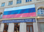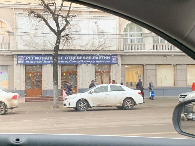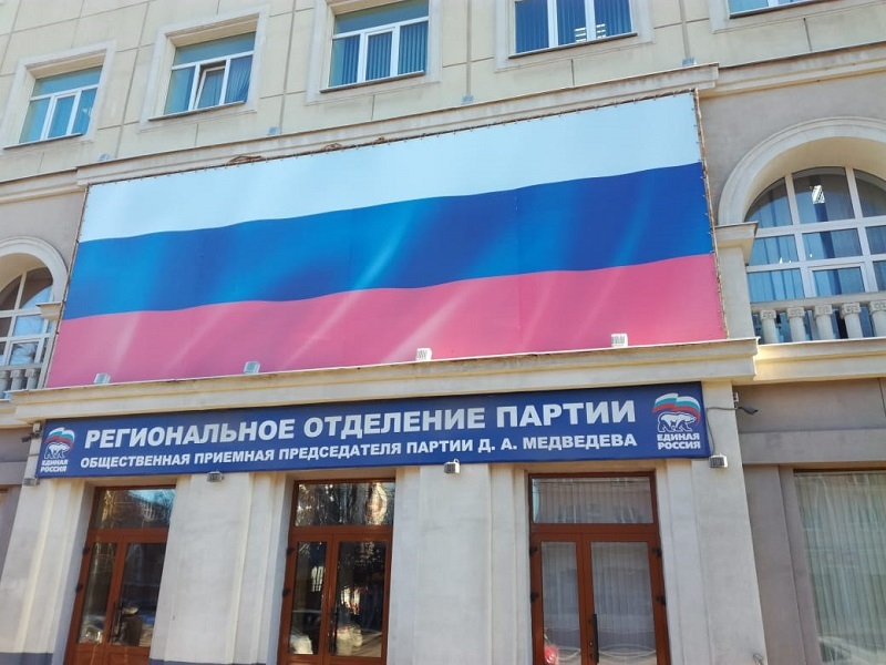 Как известно, реготделение партии власти имеет свой офис по данному адресу (проспект Революции, 33), триколор висел вместе с логотипом партии. Гордо заслоняя на объекте культурного наследия барельеф Маркса, Энгельса и Ленина.