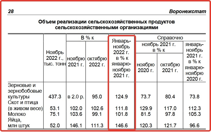 Только за ноябрь птицеводческие фабрики продали 52 млн штук яиц, то есть в среднем по 25 яиц на каждого жителя области. Также положительная динамика отмечается при реализации мяса птицы и животных (рост на 11,8%), молока (1,8%) и зерновых и зернобобовых культур (24,9%). Такие данные опубликованы Воронежстатом в четверг 12 января.