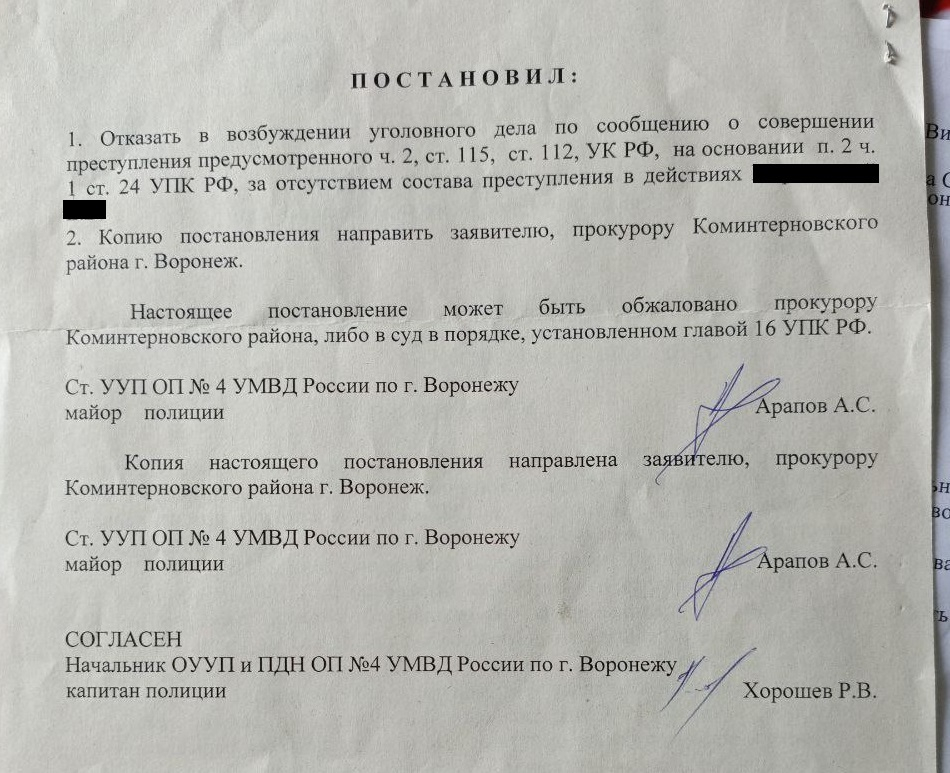 Полицейские установили личность той самой женщина. Она объяснила, что просто препятствовала удару со стороны трехлетнего мальчика по отношению к своему ребенку без применения физической силы. С местной жительницей провели профилактическую беседу, а маме того самого малыша отказали в возбуждении уголовного дела из-за отсутствия состава преступления. Соответствующее постановление есть в распоряжении «Блокнот Воронеж».