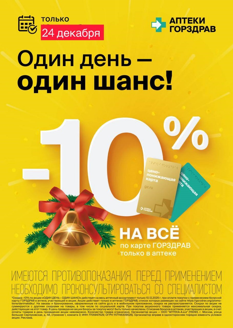 Только один день - 24 декабря получите скидку 10% на любую покупку с картой ГОРЗДРАВ в аптеке.