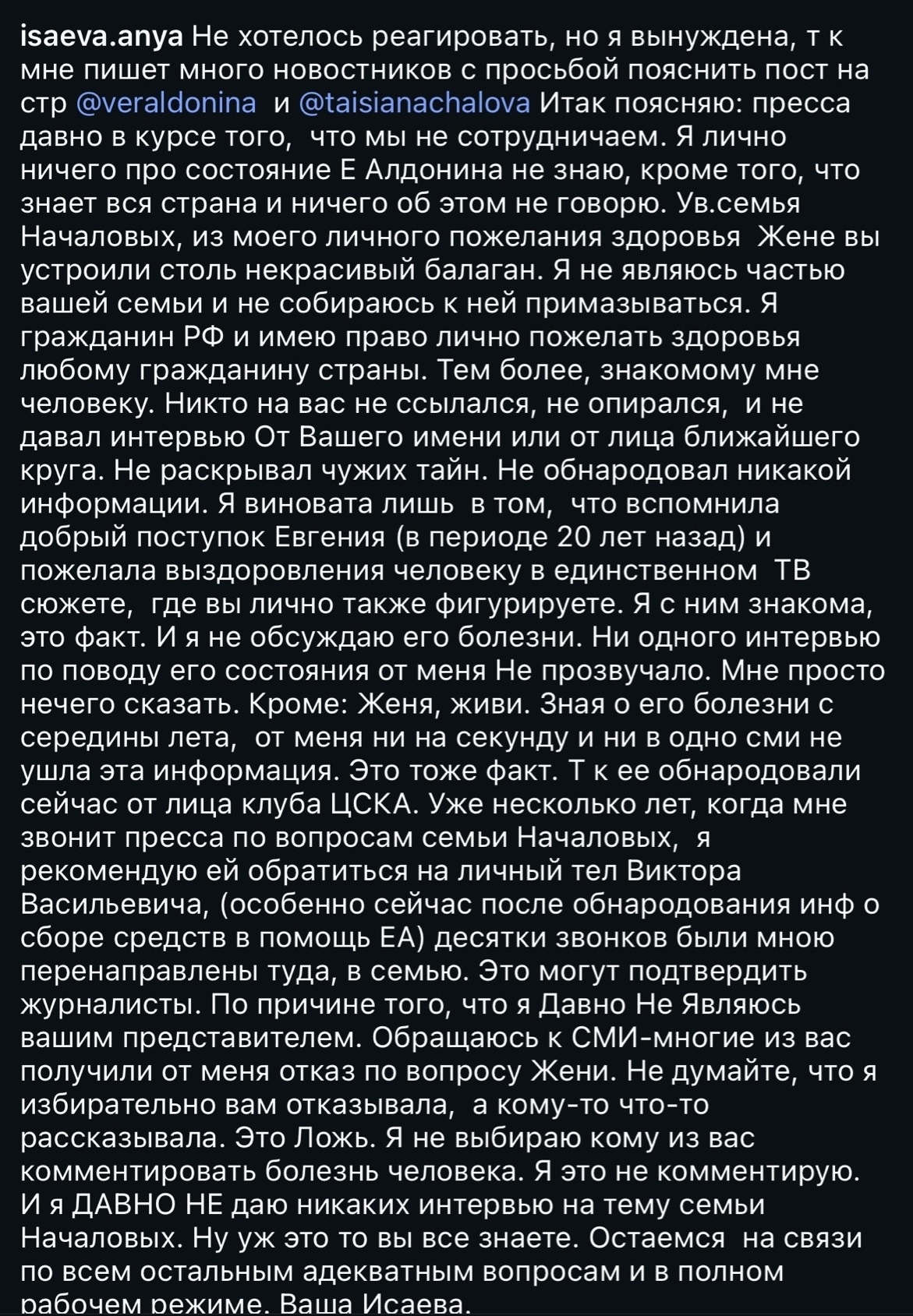 «Уважаемая семья Началовых, из моего личного пожелания здоровья Жене вы устроили столь некрасивый балаган. Я не являюсь частью вашей семьи и не собираюсь к ней примазываться. Я гражданин РФ и имею право лично пожелать здоровья любому гражданину страны. Тем более, знакомому мне человеку. Никто на вас не ссылался, не опирался и не давал интервью от вашего имени или от лица ближайшего круга. Не раскрывал тайн, не обнародовал никакой информации», – пишет в своей соцсети* Исаева.