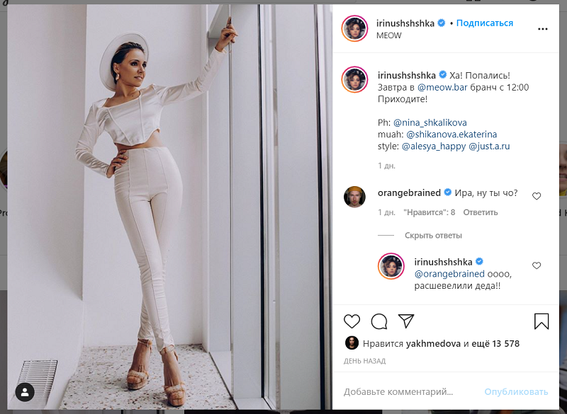 Воронежская YouTube-звезда Ирина Чеснокова опубликовала на личной странице в Instagram новую фотографию. На ней ведущая шоу «Бар в большом городе» предстала перед армией поклонников в новом для себя образе – белом утонченном костюме со шляпой.