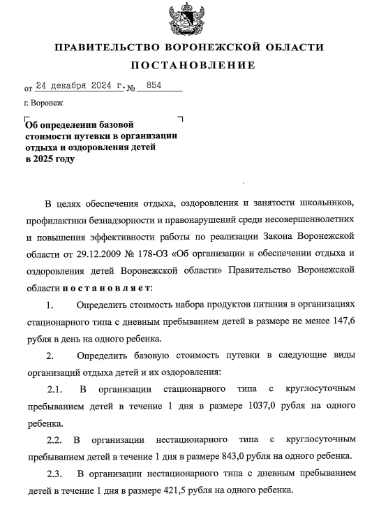 Определена базовая стоимость путевки в детские санатории в Воронежской области в 2025 году. Соответствующий документ подписал губернатор Александр Гусев.