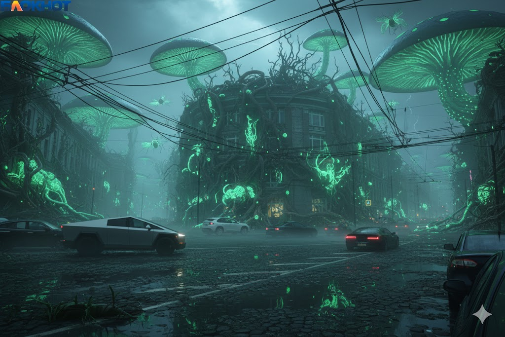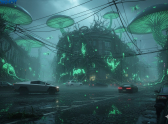 В грибном биолюминесцентном мире, поглощенном природой, «Утюжок» предстает оплетенным гигантскими мицелиями, испускающими мягкое сияние. Сквозь окна пробиваются не электрические огни, а призрачное свечение грибов, а само здание выглядит не брошенным, а гармонично встроенным в новую экосистему.
