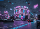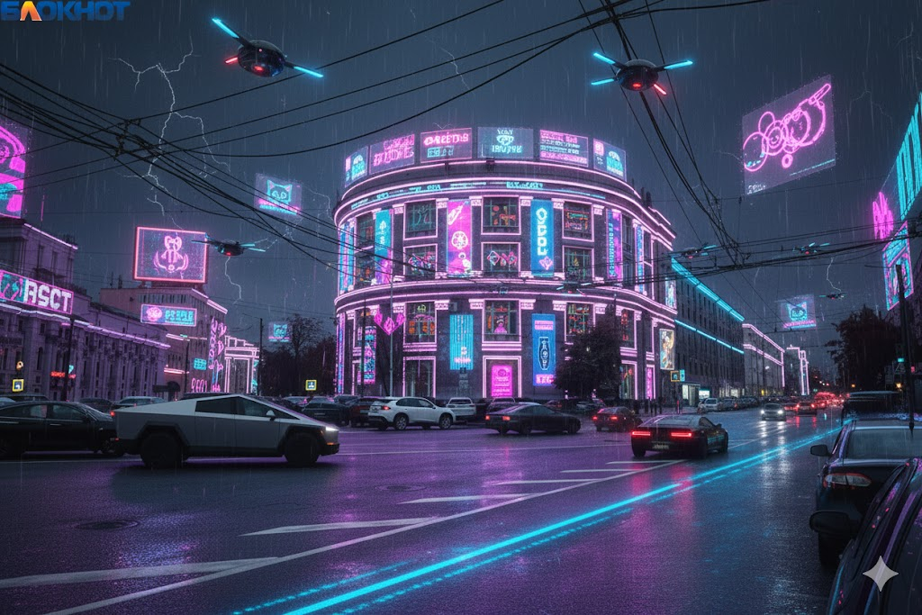 Динамичный и неоновый мир киберпанка превратил здание в элемент гигантского мегаполиса. На его стенах бегут рекламные голограммы, с балконов свисают пучки проводов, а у основания припаркованы летающие автомобили. Утюжок здесь — не памятник, а часть живой, пульсирующей цифровой среды.