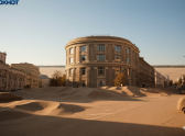 Бескрайняя пустыня засыпала нижние этажи здания барханами. Песок наступает на стены, выветривая кирпич, но силуэт по-прежнему гордо возвышается над безжизненными дюнами, как маяк, оставшийся от исчезнувшей цивилизации.