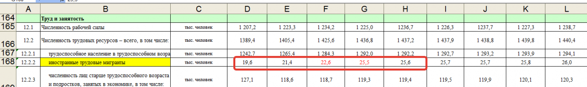 Из его данных следует, что в нынешнем году на региональном рынке труда было около 22 тыс 600 иностранных работников. В последние годы наблюдается тенденция роста иностранных трудовых мигрантов: если в 2023-м году их насчитывалось, по данным министерства экономики, 19 тыс 600 человек, то в 2026-м их может быть уже 25 тыс 500 человек (по консервативному сценарию). То есть за этот период рост составит порядка 6000 "иностранных специалистов".