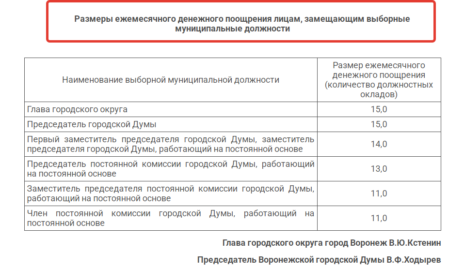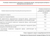 Кроме того, в положении об оплате труда депутата, выборного должностного лица местного самоуправления г. Воронеж, записаны еще такие ежемесячные денежные поощрения (от количества должностных окладов) – мэр и спикер городской думы – получают размер ежемесячного денежного поощрения – 15 должностных окладов, четыре депутата – от 11 до 14 должностных окладов.