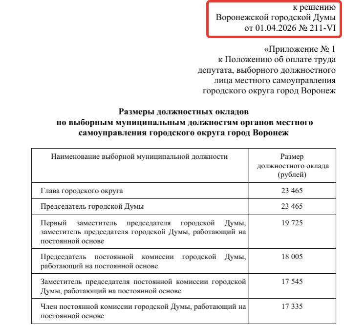Через несколько дней документ (211 –VI от 01.04.2026 «О внесении изменений в решение Воронежской городской думы от 07.09.2022 №548…») был официально опубликован, вступил в силу, причем – «задним числом», с 1 января 2026 года.