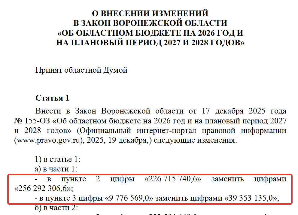 В пояснительной записке к законопроекту сообщается, что «необходимость внесения изменений в Закон Воронежской области от 17.12.2025 № 155-ОЗ «Об областном бюджете на 2026 год и на плановый период 2027 и 2028 годов» связана с увеличением расходов бюджета, корректировкой объёмов погашения кредитов, предоставленных местным бюджетам, а также перераспределением бюджетных ассигнований между главными распорядителями бюджетных средств и направлениями расходов».
