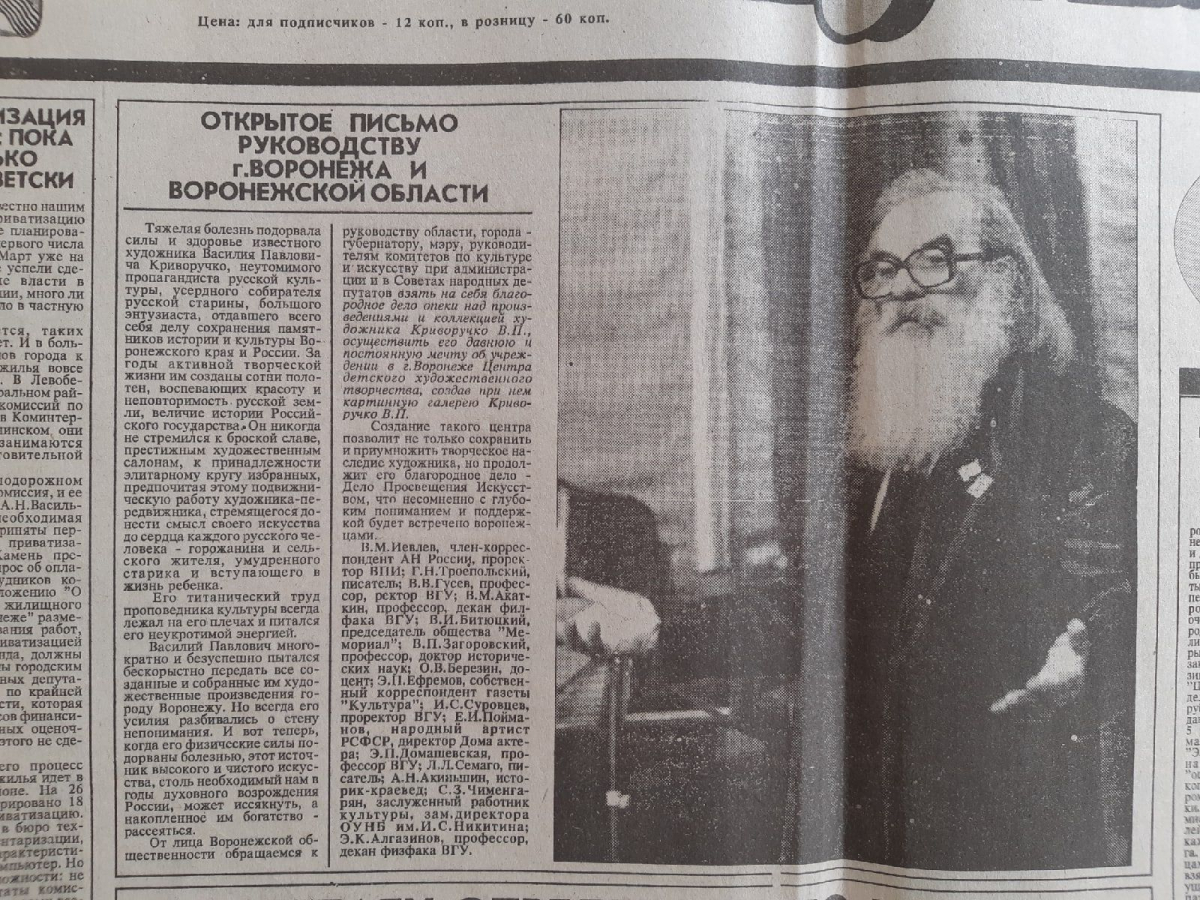 27 марта 1992 года в газете «Воронежский курьер» было опубликовано открытое письмо местных деятелей культуры и науки к руководству города и области. Под ним подписались такие маститые персоны, как автор «Белого Бима Черное Ухо» Гавриил Троепольский, краевед Владимир Загоровский, корреспондент Эдуард Ефремов, ректор ВГУ Владимир Гусев, ученый Игорь Суровцев, председатель общества «Мемориал» Вячеслав Битюцкий, народный артист РСФСР Евгений Пойманов, декан филфака Виктор Акаткин, писатель Леонид Семаго и многие, многие другие. В письме к властям известные деятели Воронежа обращались по поводу мечты гениального художника Василия Павловича Криворучко.