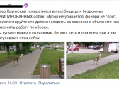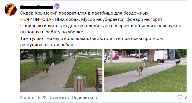 «Сквер Крымский превратился в пастбище для бездомных нечипированных собак. Мусор не убирается, фонари не горят. Проинспектируйте, кто должен следить за сквером, и объясните, как нужно выполнять работу по уборке. Там гуляют мамы с колясками, бегают дети и при всем при этом разгуливают стаи собак», – жалуется горожанка.