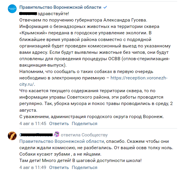 По поручению губернатора ей ответили. Городская администрация сообщила, что передала информацию о бездомных животных в управление экологии. Скоро будет организован комиссионный выезд.