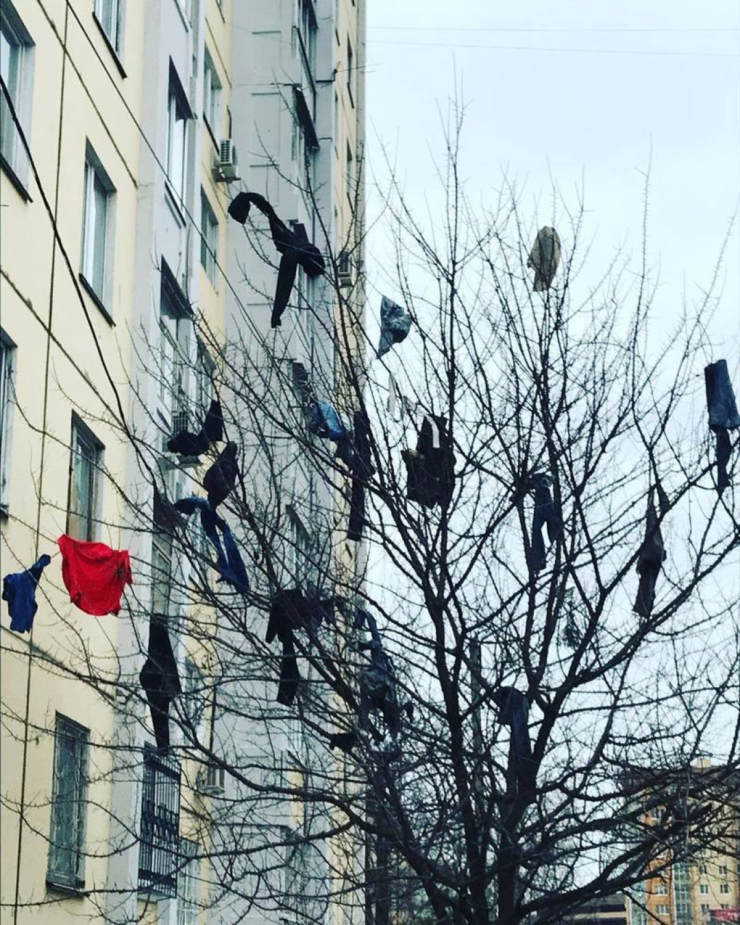 Жительница Воронежа Елена сфотографировала у одного из домов дерево, буквально усыпанное бельем. На ветках можно увидеть трусы, носки и колготки. Девушка предположила, что таким жестким методом кого-то выгоняли из дома, а, возможно, это просто способ «украсить» дерево к Новому году.