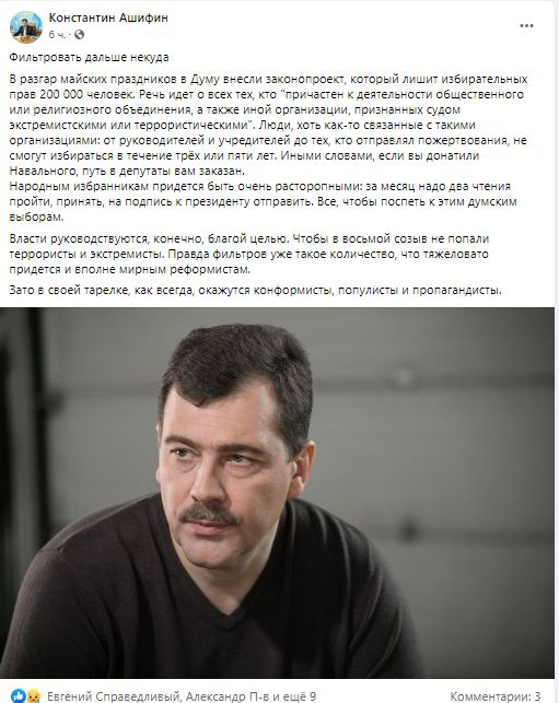 Депутат Воронежской городской Думы (фракция КПРФ) Константин Ашифин 13 мая опубликовал сообщение в своем Facebook. В этом посте коммунист рассказал о том, что на майских праздниках в Госдуму внесли законопроект, который может лишить избирательных прав порядка 200 тыс человек в России. Это – те, кто «причастен к деятельности общественного или религиозного объединения, а также иной организации, признанных судом экстремистскими или террористическими». Иными словами, люди хоть как-то связанные с подобными структурами (от руководителя и учредителя до тех, кто просто отправлял пожертвования в организации), теперь не смогут избираться в органы власти в течение 3 или 5 лет.