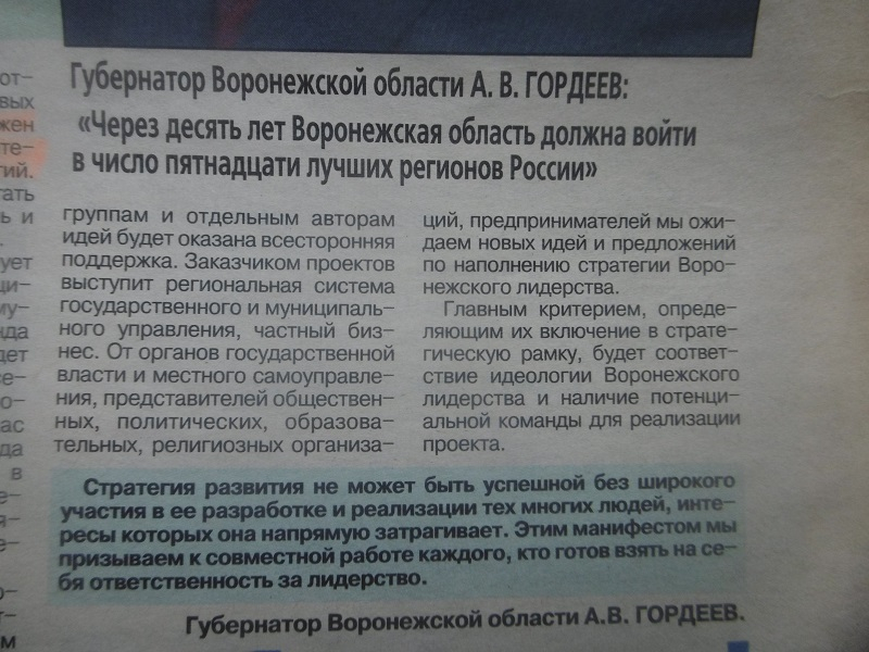 Это День рождения самого бездарного регионального государственного документа, претендовавшего на роль стратегического и судьбоносного, за все тридцать лет существования Воронежской области. Под этот документ новый губернатор Алексей Гордеев должен был мобилизовать свою разношерстную команду, население и политическую элиту на прорывные участки социально- экономического развития региона. Кроме того, под этот документ шли в бой кандидаты в депутаты Воронежской областной Думы (выборы проходили в марте), как люди авторитетные и деятельные, типа Николая Гапоненко, так и прохиндеи, каких ещё свет не видывал. Я имею в виду сотворивших Воронежскую коммунальную палату и обобравших на коммунальных платежах население города Воронежа в 2010-2011 годах как липку. Этот документ, если пристально рассматривать любопытные нюансы, рождался в муках в управлении экспертной и контрольной работы правительства области. Готовился офисным планктоном в лице А. Маркова, С. Соколова, А. Холода и прочих малопроизводительных бюрократов.