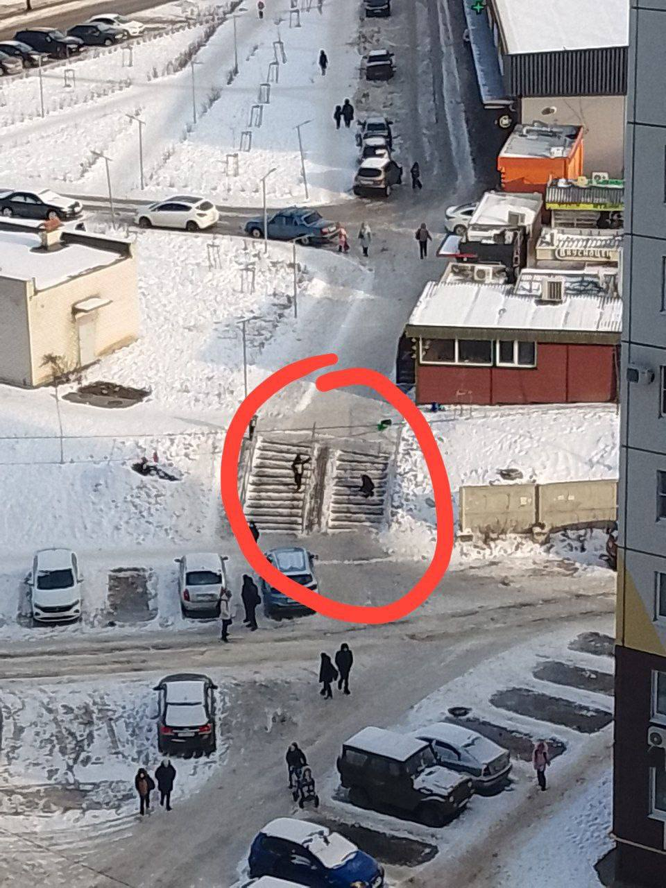 Видимо, ребятня, находчивая в вопросах веселья, обнаружила, что наклонные поверхности и ступеньки — отличная альтернатива игровым площадкам. Пластиковые ледянки, картонки и просто штаны становятся замечательным «транспортным средством».
