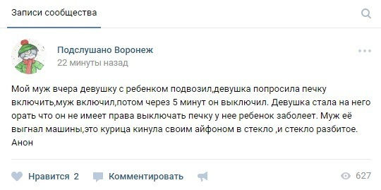 - Мой муж вчера девушку с ребенком подвозил, девушка попросила печку включить, муж включил, потом через 5 минут он выключил. Девушка стала на него орать, что он не имеет права выключать печку у нее ребенок заболеет. Муж её выгнал машины, это курица кинула своим айфоном в стекло, и стекло разбитое, - рассказывает супруга водителя.