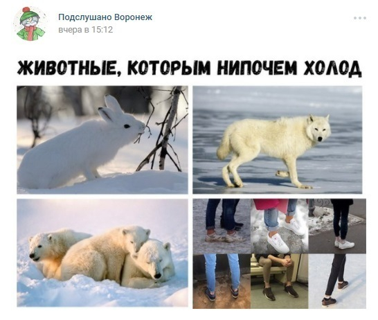 Жители столицы Черноземья обсуждают подвороты на джинсах после опубликованной картинки. На ней представлены животные, которым не страшен холод. В компании медведя, волка и зайца оказались люди, которые ходят с подворотами в мороз. Горожане пишут, что не понимают, зачем молодые люди оголяют ноги.
