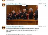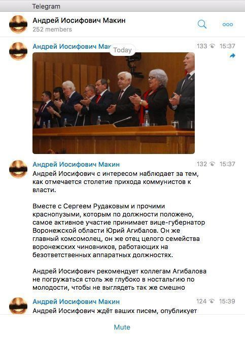 - Андрей Иосифович с интересом наблюдает за тем, как отмечается столетие прихода коммунистов к власти. Вместе с Сергеем Рудаковым и прочими краснопузыми, которым по должности положено, самое активное участие принимает вице-губернатор Воронежской области Юрий Агибалов. Он же главный комсомолец, он же отец целого семейства воронежских чиновников, работающих на безответственных аппаратных должностях. Андрей Иосифович рекомендует коллегам Агибалова не погружаться столь же глубоко в ностальгию по молодости, чтобы не выглядеть так же смешно, - была подписана фотография в Telegram-канале «Андрей Иосифович Макин».