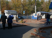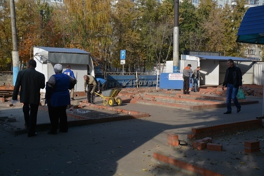 работы по освобождению особо охраняемой зоны теплотрассы. В другой части еще работают продавцы и жители совершают покупки.