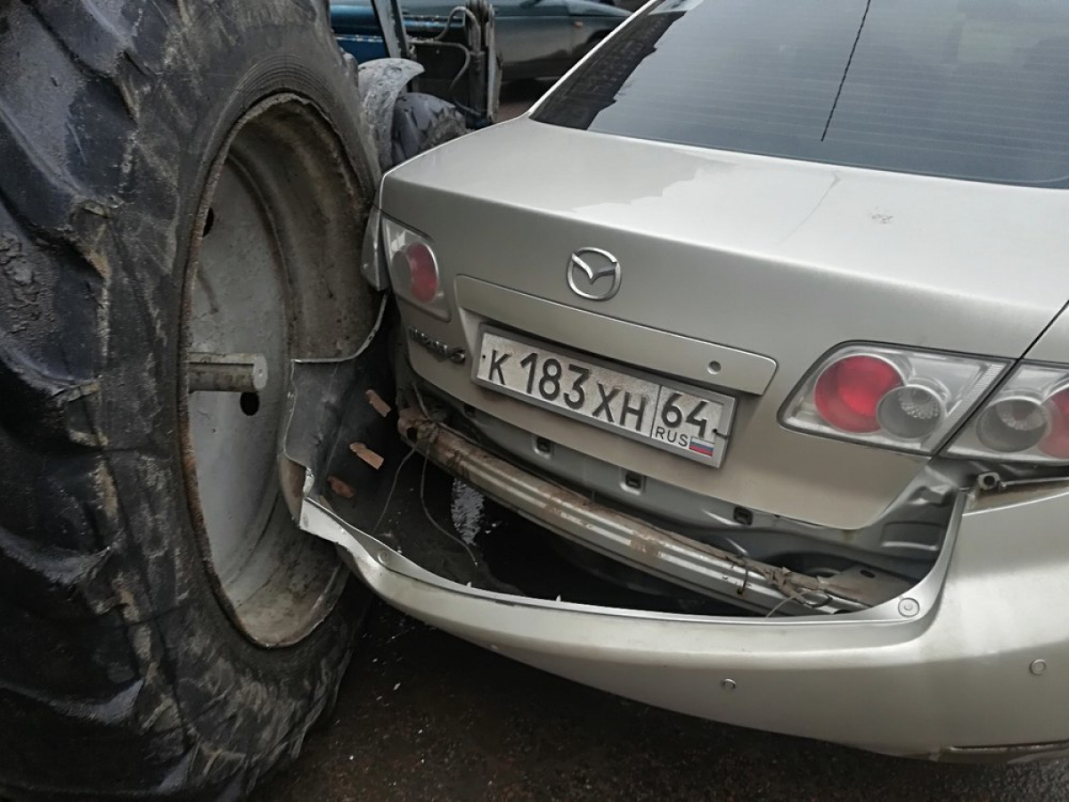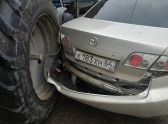 На опубликованных в Сети снимках видно, что трактор задел свои большим колесом задний бампер Mazda, из-за чего он частично отвалился.