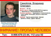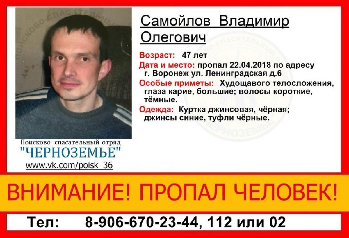В Воронеже волонтеры поискового отряда «Черноземье» объявили о пропаже Владимира Олеговича Самойлова. Известно, что 47-летний мужчина ушел из дома №6 на улице Ленинградская, в воскресенье, 22 апреля 2018 года.