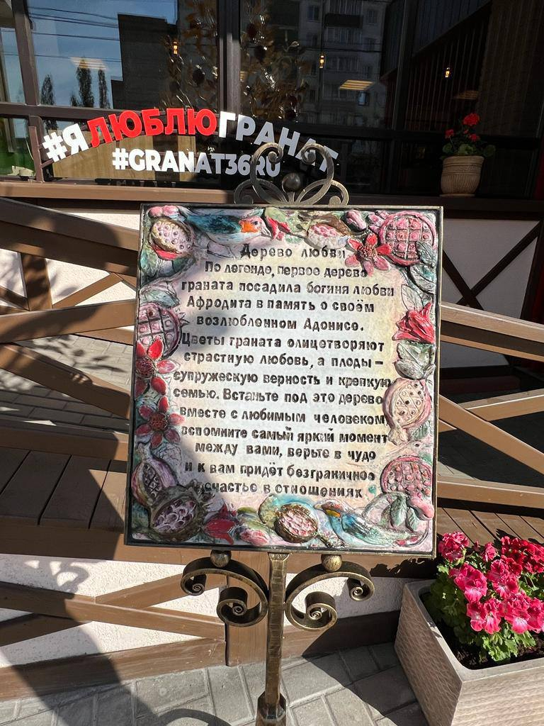 «По легенде первое дерево граната посадила богиня любви Афродита в память о своем возлюбленном Адонисе. Цветы граната олицетворяют страстную любовь, а плоды - супружескую верность и крепкую семью. Встаньте под это дерево вместе с любимым человеком, вспомните самый яркий момент между вами, верьте в чудо и к вам придет безграничное счастье в отношениях».