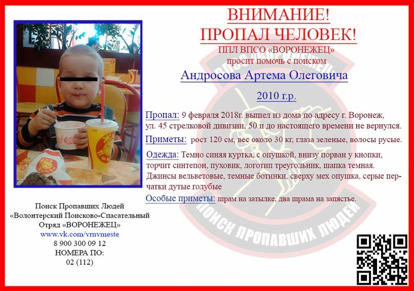 В поисковом отряде «Черноземье» сообщили, что рост Артема - 20 см, а вес – 30 кг. У малыша зеленые глаза и русые волосы. Из особых примет мальчика можно выделить шрам на затылке и два шрама на запястье.