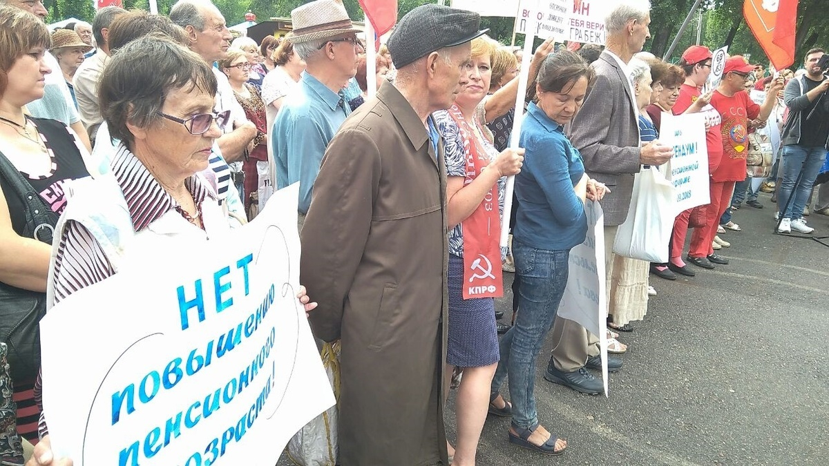 Напомним, речь идёт об увеличении пенсионного возраста россиян на 5-8 лет: для мужчин с 60 лет до 65, для женщин - с 55 до 63 лет. Данные цифры мелькали на плакатах в парке «Южный»: «5 и 8 лет отсрочки доведут народ до точки!»