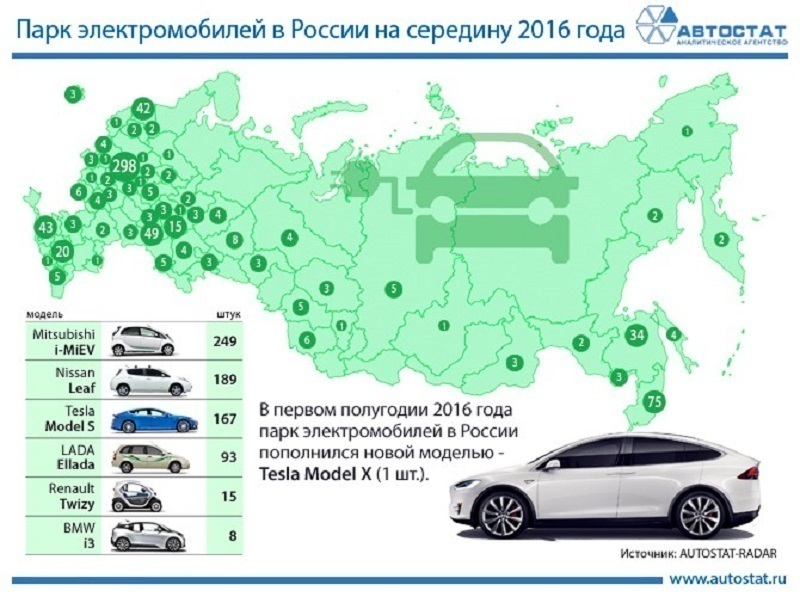 Согласно данным аналитического агентства «АВТОСТАТ», в России на 1 июля 2016 года насчитывается 722 электромобиля, представленных семью моделями.