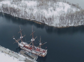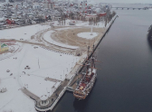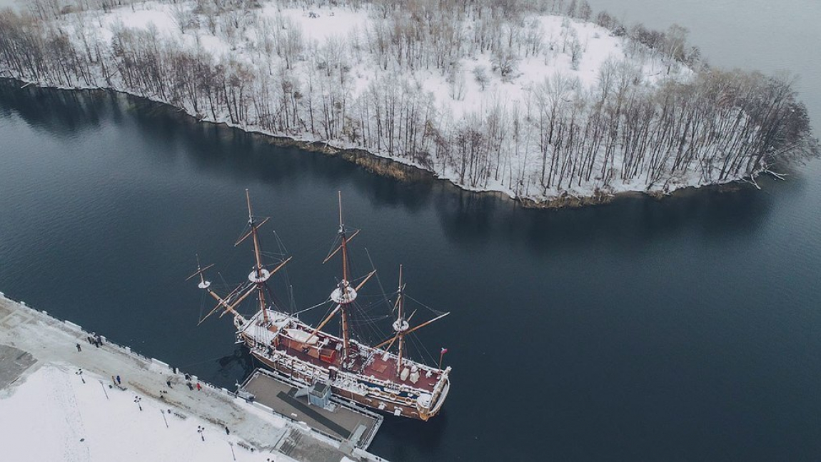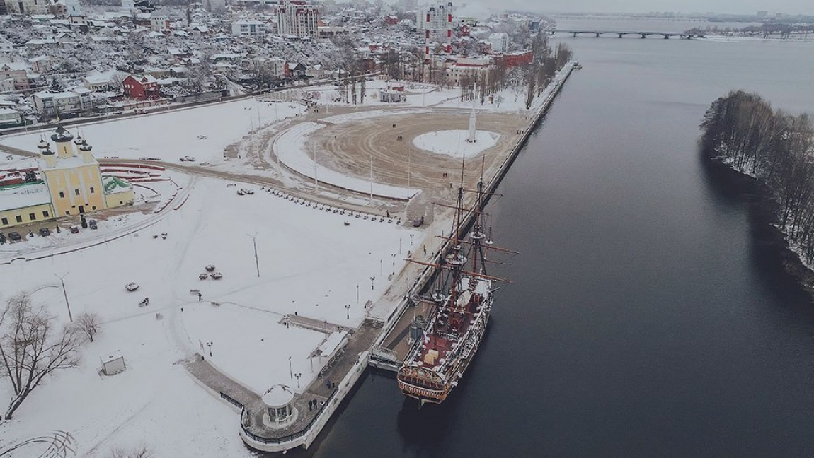 Жительница столицы Черноземья Алена Бадамшина сфотографировала с высоты птичьего полета один из главных символов Воронежа – корабль «Гото Предестинация». Снимок сделали после снегопада, который обрушился на город в конце ноября, на нем корабль выглядит чрезвычайно величественно.