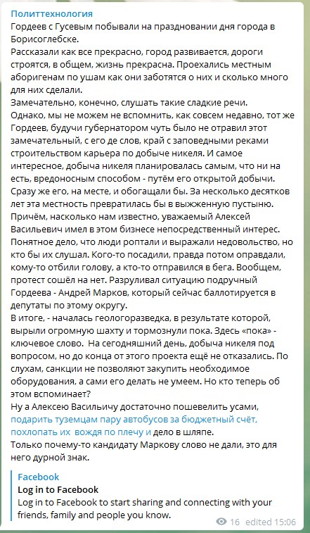 – За несколько десятков лет эта местность превратилась бы в выжженную пустыню. Причём, насколько нам известно, уважаемый Алексей Васильевич имел в этом бизнесе непосредственный интерес, – пишет «Политтехнология». – Понятное дело, что люди роптали и выражали недовольство, но кто бы их слушал. Кого-то посадили, правда, потом оправдали, кому-то отбили голову, а кто-то отправился в бега. В общем, протест сошёл на нет. Разруливал ситуацию подручный Гордеева - Андрей Марков, который сейчас баллотируется в депутаты по этому округу. В итоге началась геологоразведка, в результате которой, вырыли огромную шахту и тормознули пока. Здесь «пока» - ключевое слово. На сегодняшний день добыча никеля под вопросом, но до конца от этого проекта ещё не отказались. По слухам, санкции не позволяют закупить необходимое оборудование, а сами его делать не умеем. Но кто теперь об этом вспоминает? Ну а Алексею Васильичу достаточно пошевелить усами, подарить туземцам пару автобусов за бюджетный счёт, похлопать их вождя по плечу и дело в шляпе. Только почему-то кандидату Маркову слово не дали, это для него дурной знак.