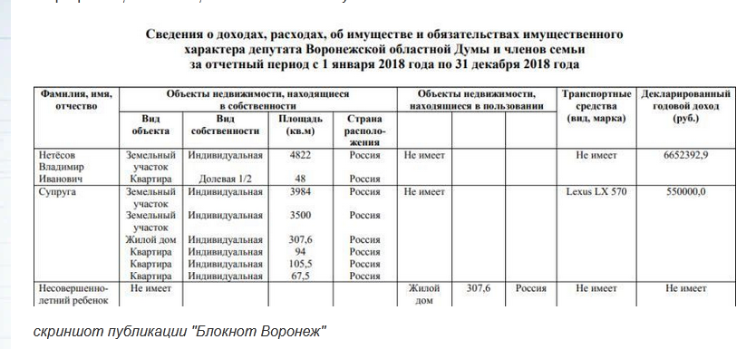Но за время "воронежского лидерства" Владимир Нетесов, вероятно, понес существенные потери на семейном фронте. Примерно с 2019 года он прекратил в своей декларации размещать информацию о супруге и несовершеннолетнем ребенке. Хотя у его жены в 2018-м году появилось в собственности две квартиры – площадью 105,5 кв м и 67,5 кв м.